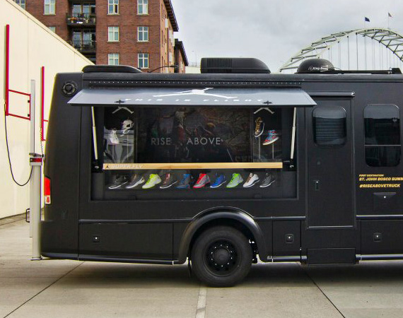 This truck yields for no one! After Nike Football’s MRAP-inspired promotional vehicle and its Transformer Mobile Retail Store, Jordan Brand will be introducing a new addition to its vehicle fleet – the Rise Above Truck. Covered in matte black motif along with an oversized Jumpman logo, the Truck is quipped with outdoor speakers and lights for those quick pick-up games. On board are also measuring instruments, including a vertical jump sensor, as well as countless pairs of Jordan Super.Fly. The Jordan Brand – Rise Above Truck will be making stops at basketball venues cross country this summer. To follow its movement, simply sign up for Jordan Brand Twitter profile at @jumpman23.